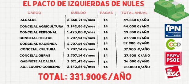Los vecinos de Nules pagarán de sus bolsillos al gobierno más caro de la historia de la localidad, un pacto de izquierdas que impone al municipio 331.900 euros al año. El acuerdo se ha alcanzado hoy en pleno con el voto en contra del PP, que ha reclamado "sentido común" a CeN, PSOE y EU para no imponer al municipio una carga que se elevará a 1.327.600 euros durante todo el mandato.